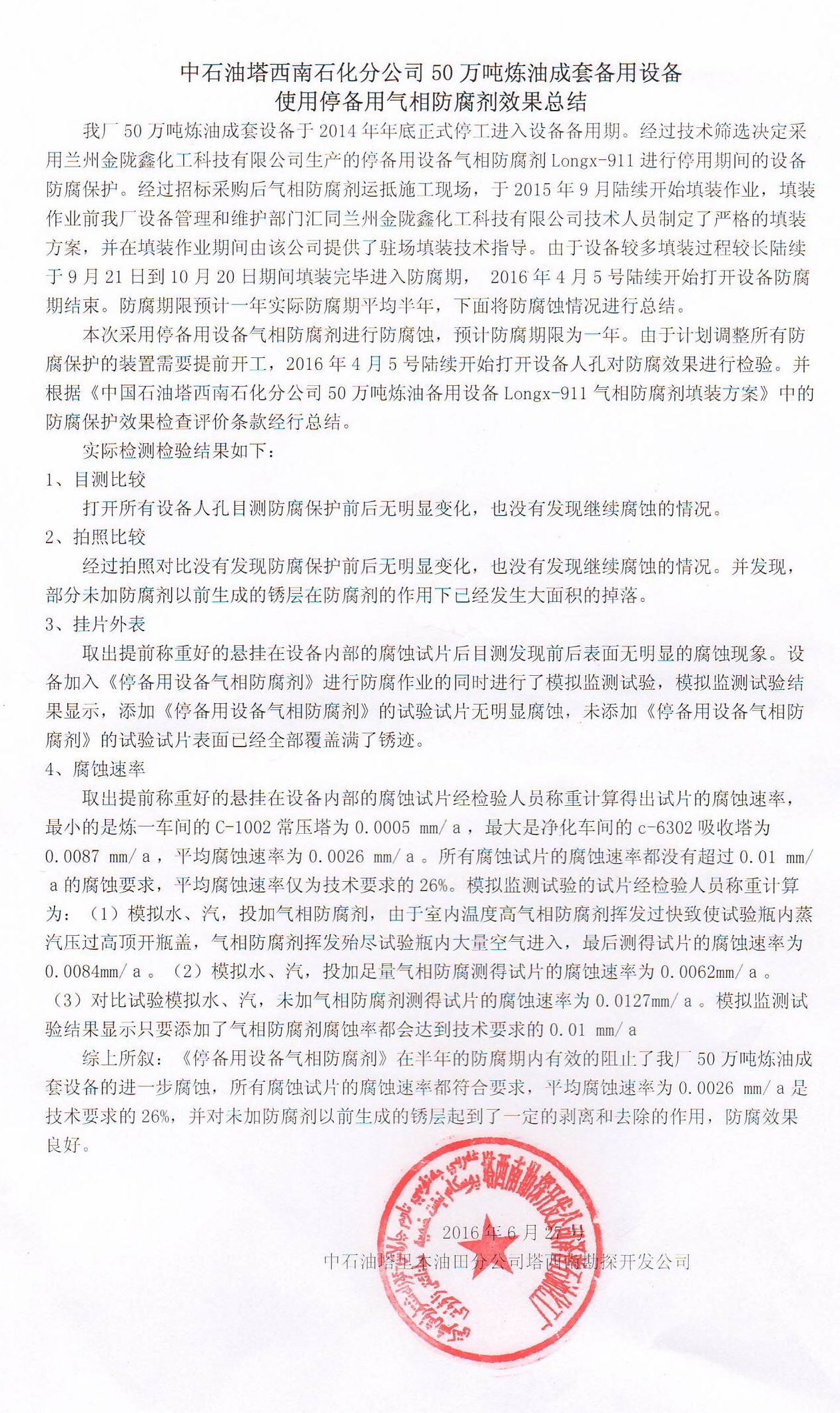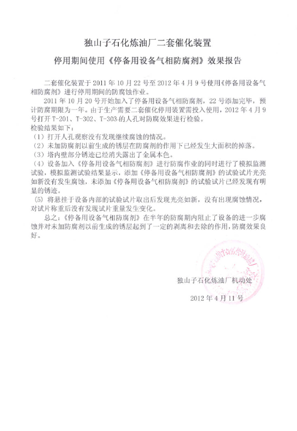 實用新型專利證書 《停備用設備氣相防腐劑》用戶使用效果報告