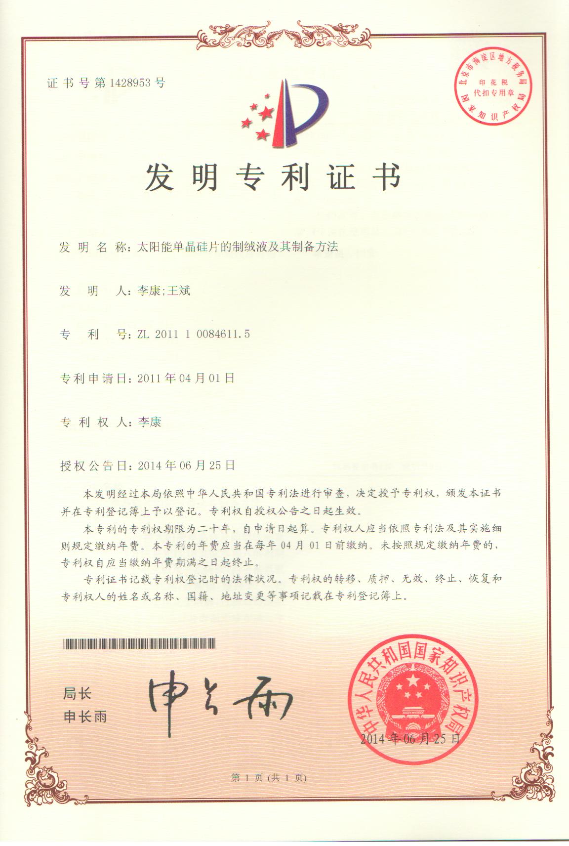 發(fā)明專利證書