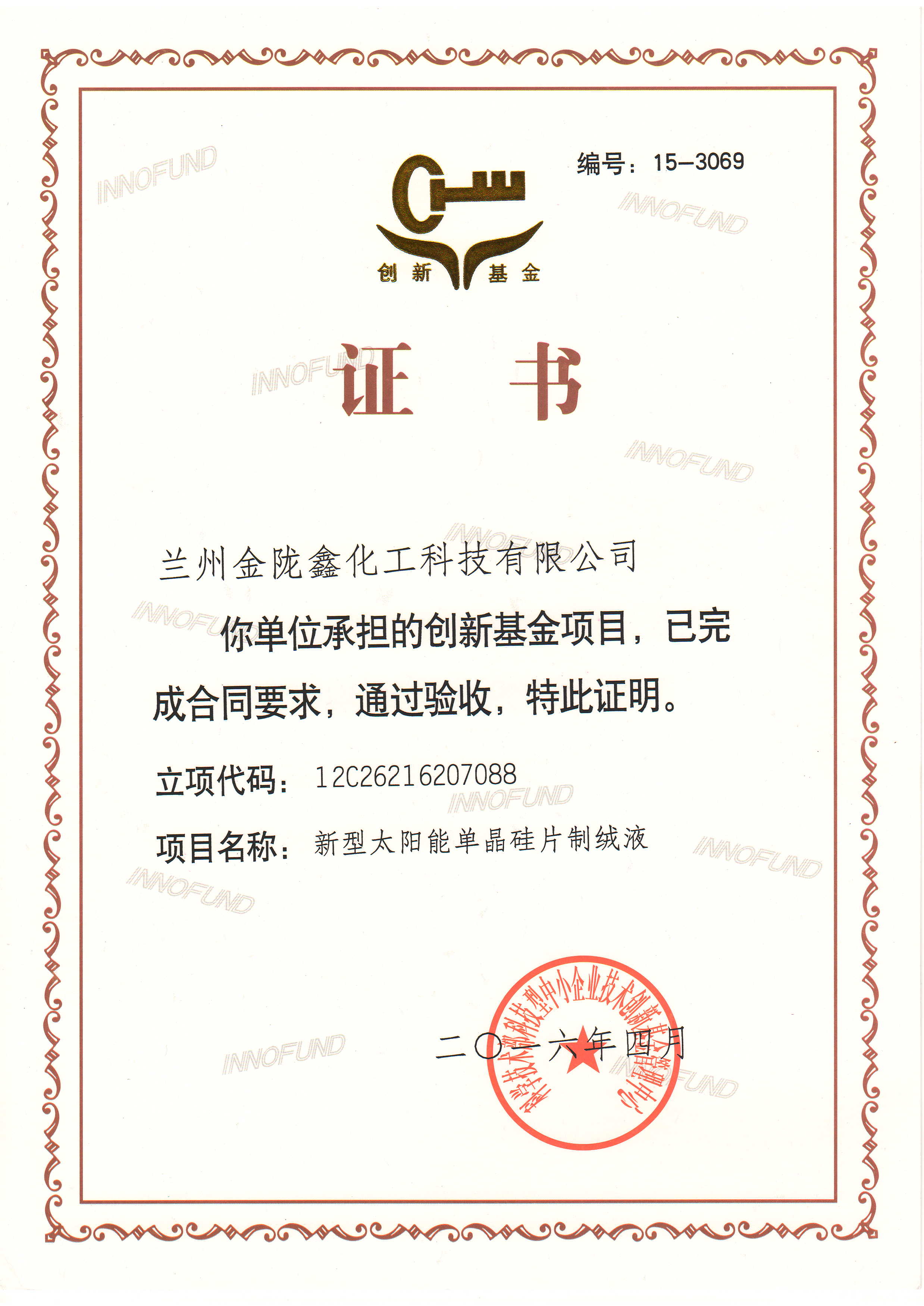 我公司2012年申請承擔(dān)的國家科學(xué)技術(shù)部的《新型太陽能單晶硅片制絨液》項目,目前已經(jīng)通過科技部驗收并拿到了驗收證書。
